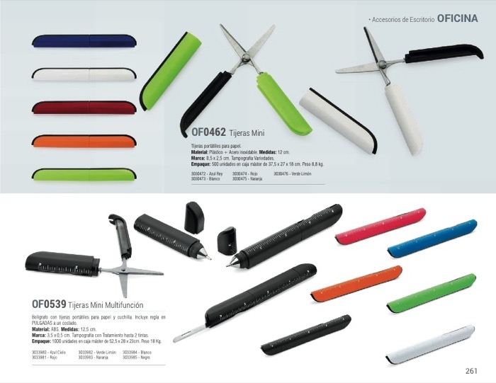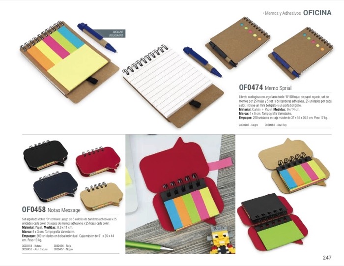 Libretas, cuadernos, carpetas, ecológicas, calculadoras, notas, sticker, separalibros, soporte de celulares, bolsas, tijeras, colores, set de oficina, lamparas de escritorio, alcancías, porta documentos, clips, tarjeteros, porta carteras, mouse pad, soporte de cinta pegante.