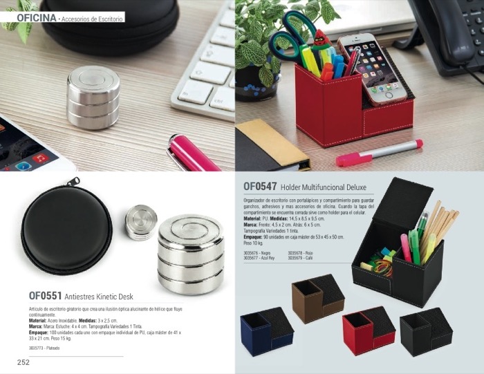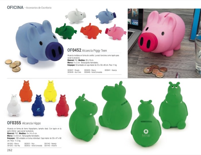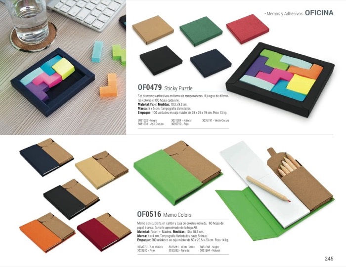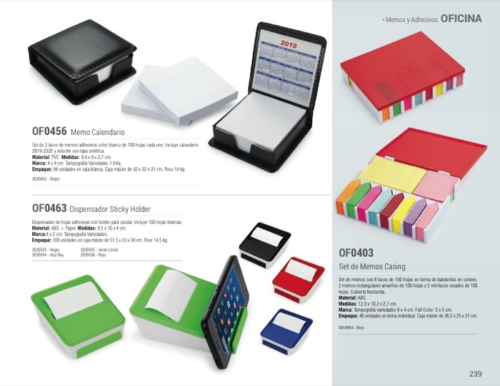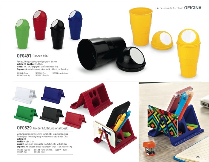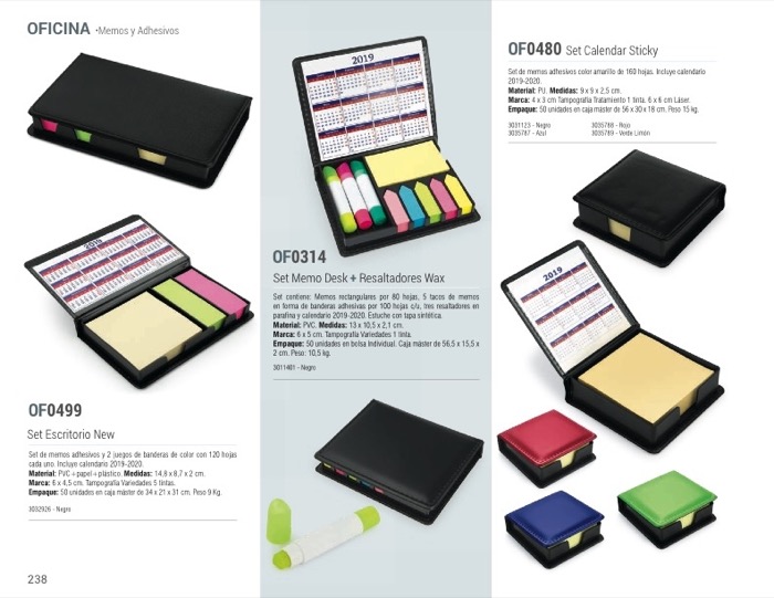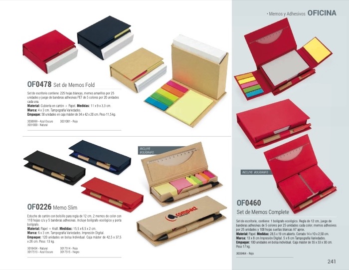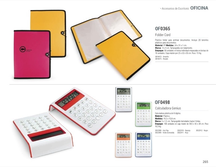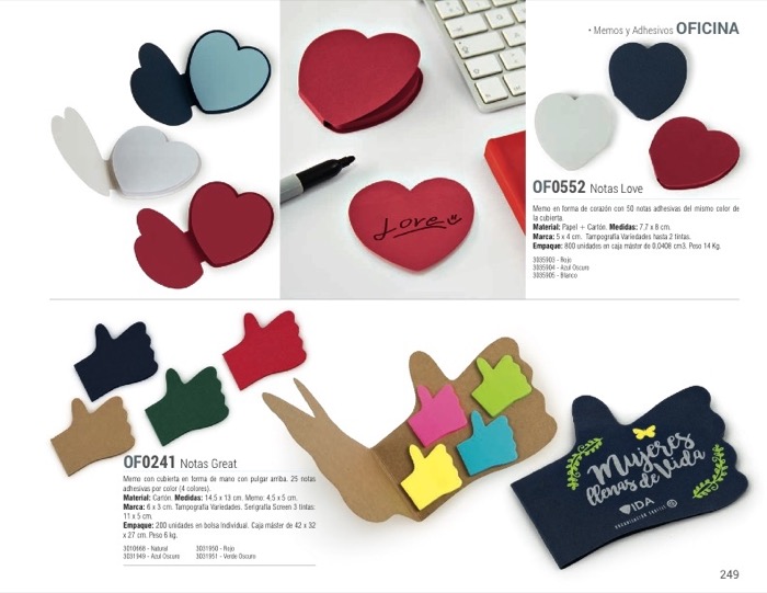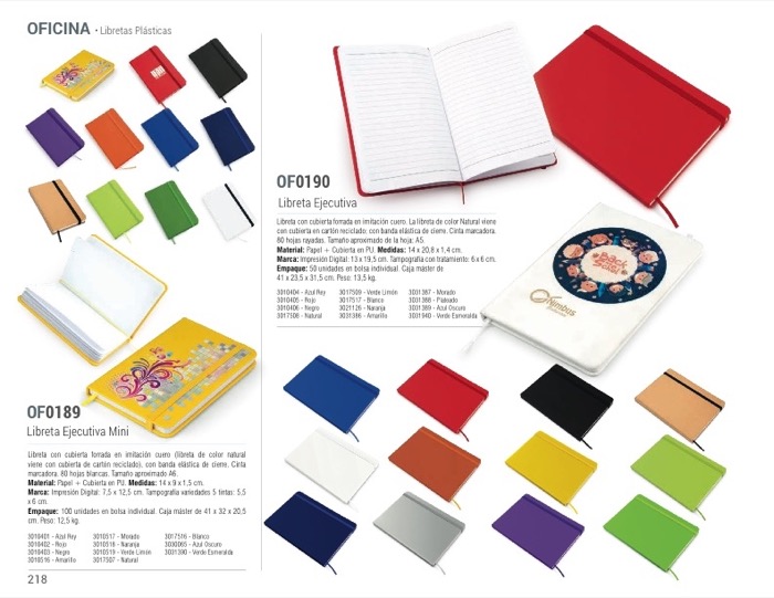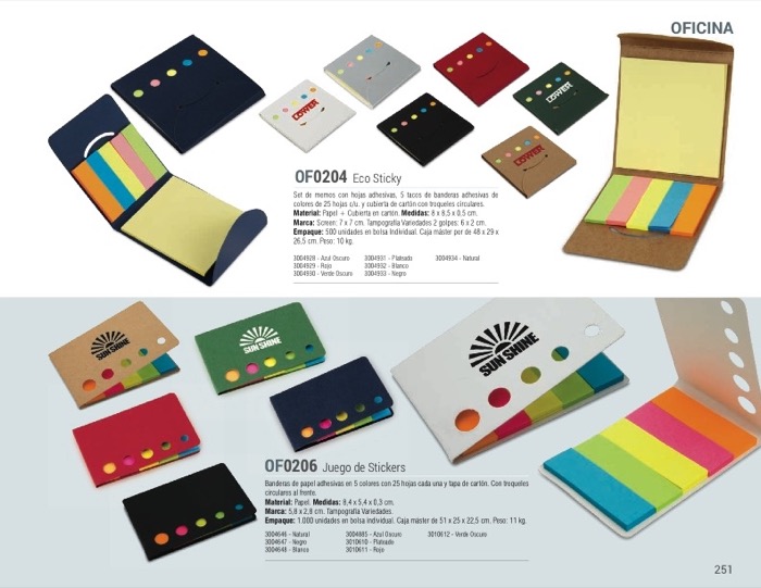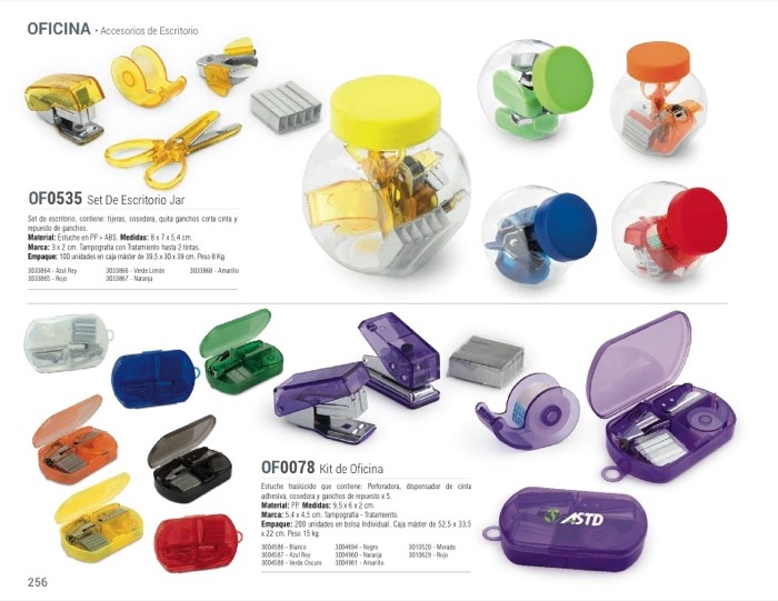 Libretas, cuadernos, carpetas, ecológicas, calculadoras, notas, sticker, separalibros, soporte de celulares, bolsas, tijeras, colores, set de oficina, lamparas de escritorio, alcancías, porta documentos, clips, tarjeteros, porta carteras, mouse pad, soporte de cinta pegante.